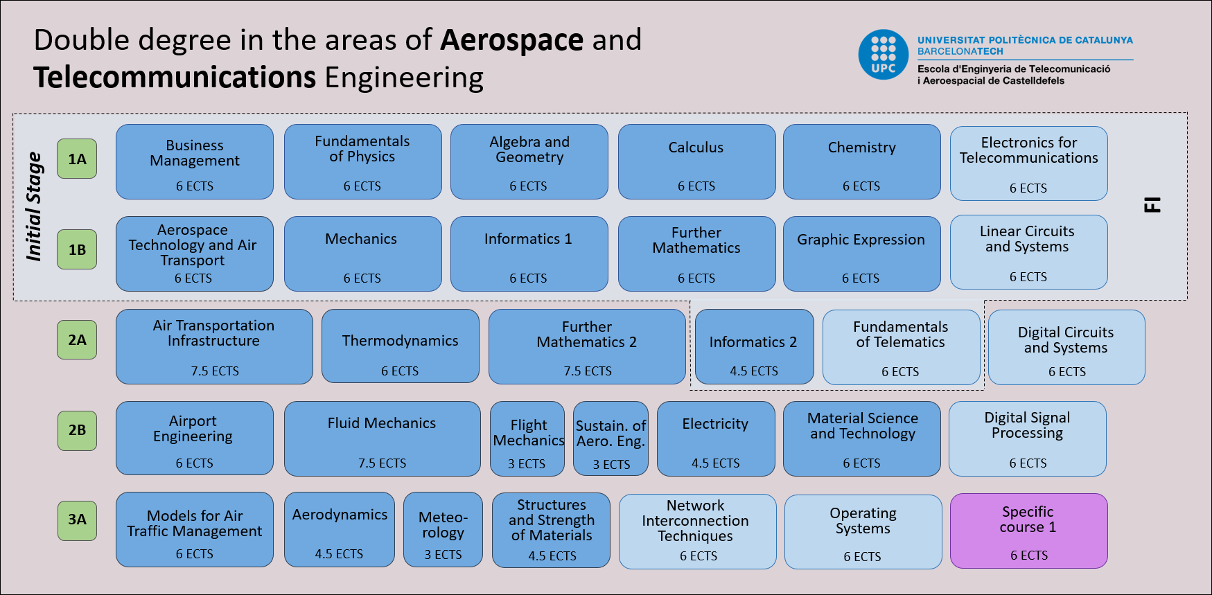 The following is a detail of the curriculum of the double bachelor's degree in Aerospace Systems Engineering (Major in Air Navigation or Major in Airports) and Telecommunications Systems or Network Engineering of the EETAC. For further information on access, grants, registration, enrolment, etc. click on this link.
